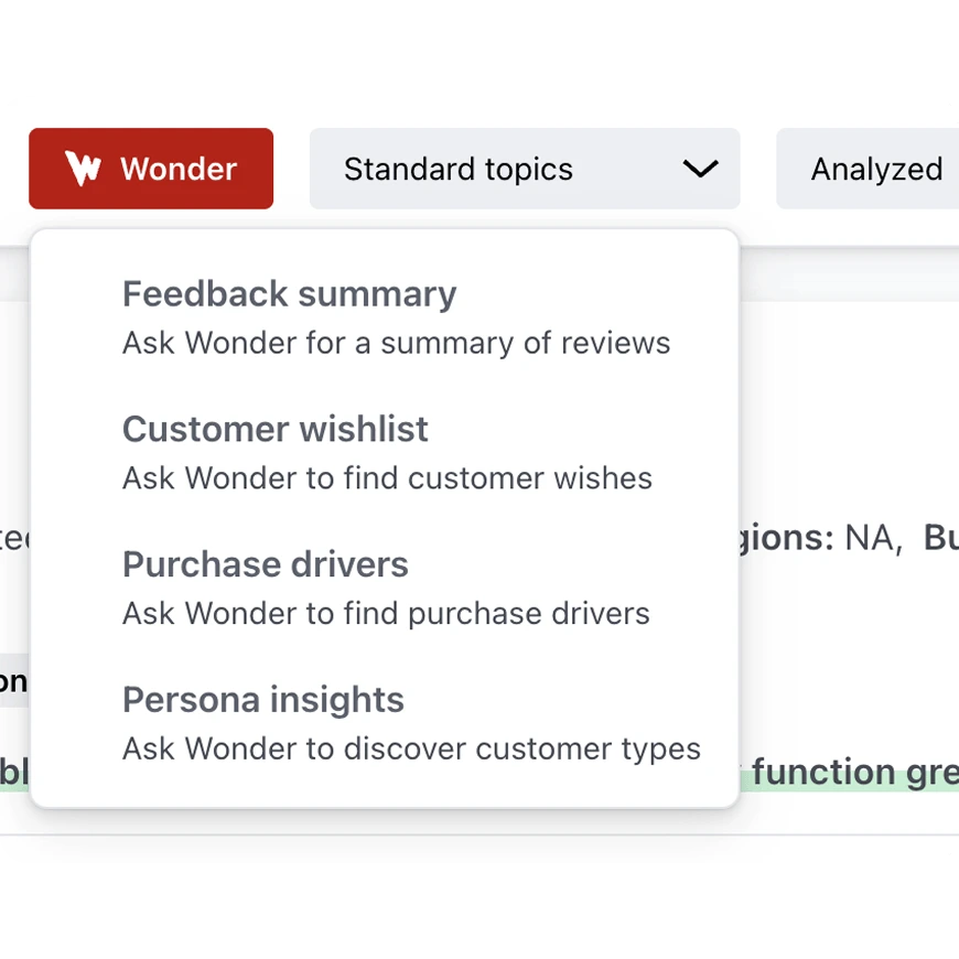 Our Voice of the Customer (VoC) sidekick. Engage in dynamic conversations with your data to receive qualitative summaries and actionable recommendations. Wonder AI simplifies complex insights, helping you make informed decisions with ease and efficiency.